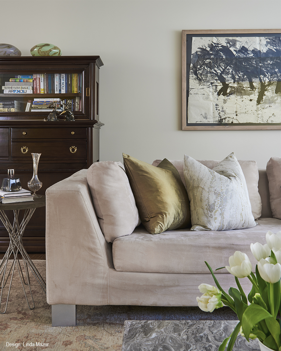 A blush sofa acts as a perfect backdrop for golden hues and interesting textures in this mid-century modern home designed by Linda Mazur. The blush tones are also picked up in the beautiful area rug.